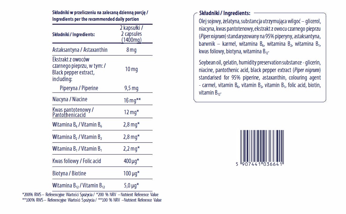 Olej sojowy, żelatyna, substancja utrzymująca wilgoć – glicerol, niacyna, kwas pantotenowy, ekstrakt z owocu czarnego pieprzu (Piper nigrum) standaryzowany na 95% piperyny, astaksantyna, barwnik – karmel, witamina B6, witamina B2, witamina B1, kwas foliowy, biotyna, witamina B12.