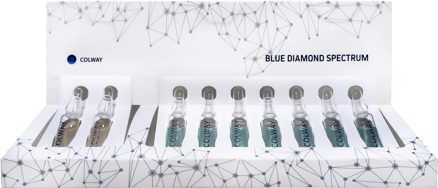 Ampułki BLUE DIAMOND SPECTRUM – produkt kategorii SURGERY LIKE – to trzeci, po kremie i peelingu, kosmetyk z innowacyjnej linii produktów COLWAY, opatrzonych symbolem drogocennego Niebieskiego Diamentu. Ampułki idealnie dopełniają działanie wymienionych produktów, a dzięki bogactwu zawartości unikatowych składników są prawdopodobnie jedynymi na świecie ampułkami dającymi efekty, które przypominają rezultaty osiągane przez najlepszych chirurgów plastycznych.