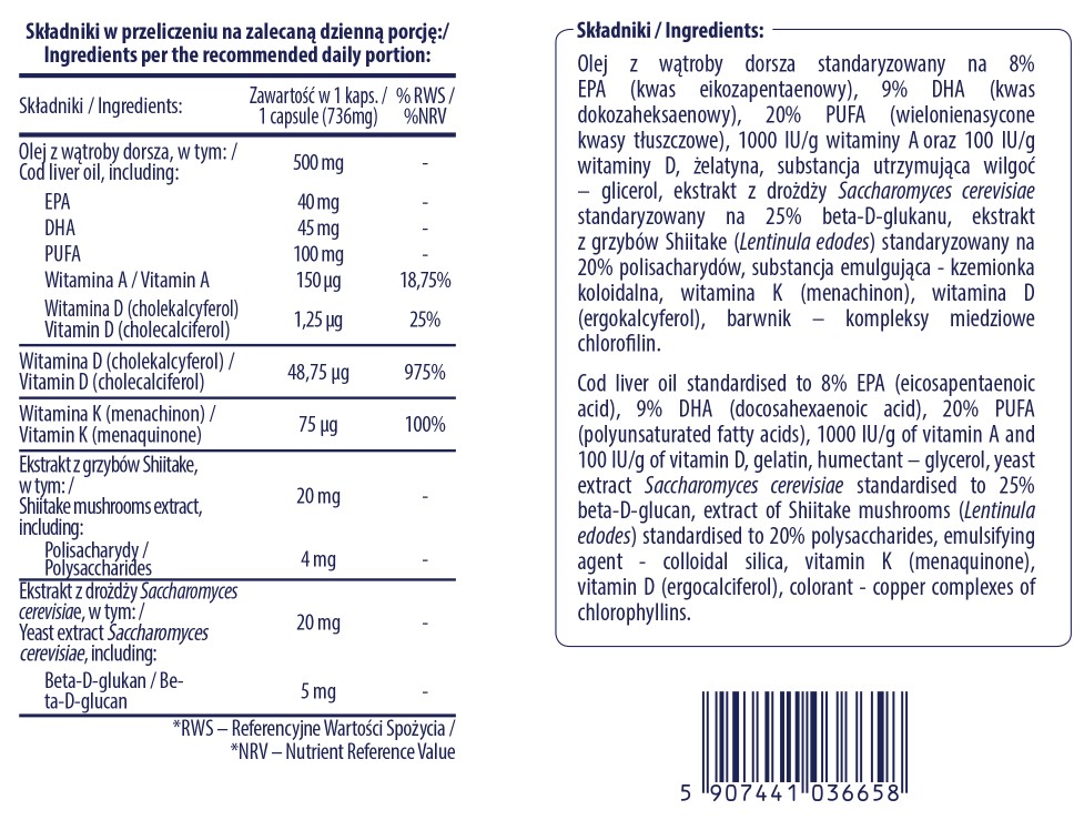 Olej z wątroby dorsza standaryzowany na 8% EPA (kwas eikozapentaenowy), 9% DHA (kwas dokozaheksaenowy), 20% PUFA (wielonienasycone kwasy tłuszczowe), 1000 IU/g witaminy A oraz 100 IU/g witaminy D, żelatyna, substancja utrzymująca wilgoć – glicerol, ekstrakt z drożdży Saccharomyces cerevisiae standaryzowany na 25% beta-D-glukanu, ekstrakt z grzybów Shiitake (Lentinula edodes) standaryzowany na 20% polisacharydów, substancja emulgująca – krzemionka koloidalna, witamina K (menachinon), witamina D (cholekalcyferol), barwnik – kompleksy miedziowe chlorofilu (chlorofilina).
